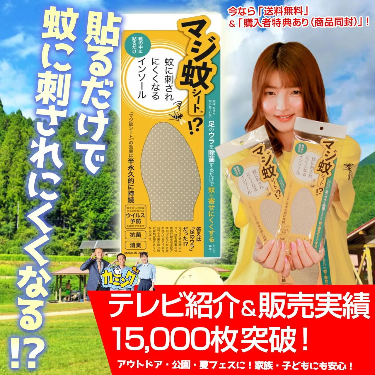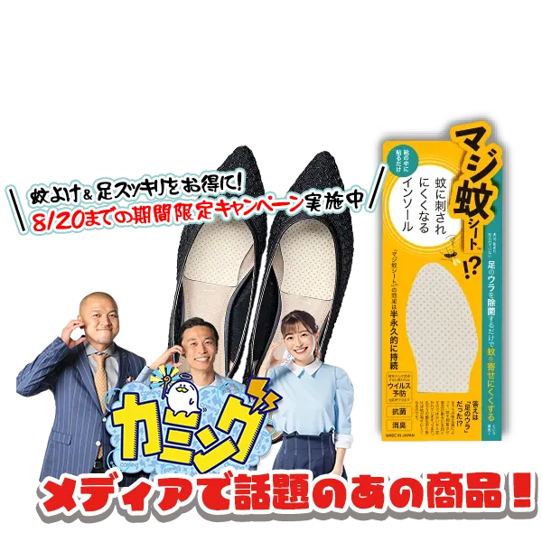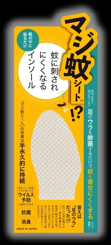 普段お使いの靴に専用のインソールシートを入れておくだけで、蚊に刺されにくくなるという利点のある商品です。汗をかきやすい方をはじめ、お酒をよく飲まれる方など、体温が上がりやすい方のほうが蚊に刺されやすい傾向があり、特に足裏の常在菌が出す臭いに蚊は引き寄せられると言われています。おすすめしているインソールシートは消臭や除菌、抗菌効果が期待できる商品です。