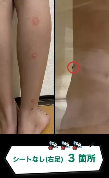 実験用に蚊を採集し、検証してみました。左足はマジ蚊シートを足裏に装着し、右足はそのままにしました。ケース内に10匹の蚊を放ち、足を入れてみます。すると、マジ蚊シート未装着の右足は、足を入れてから2分後、1匹にかまれました。その後も、インソールシート装着の左足には寄り付かず、右足ばかりを刺します。約10分間の実験の結果、蚊に刺されたのは右足が3箇所、マジ蚊シート装着の左足は1か所も刺されませんでした。シート装着の効果は抗菌・消臭で、装着した足のニオイも無くなっていました。